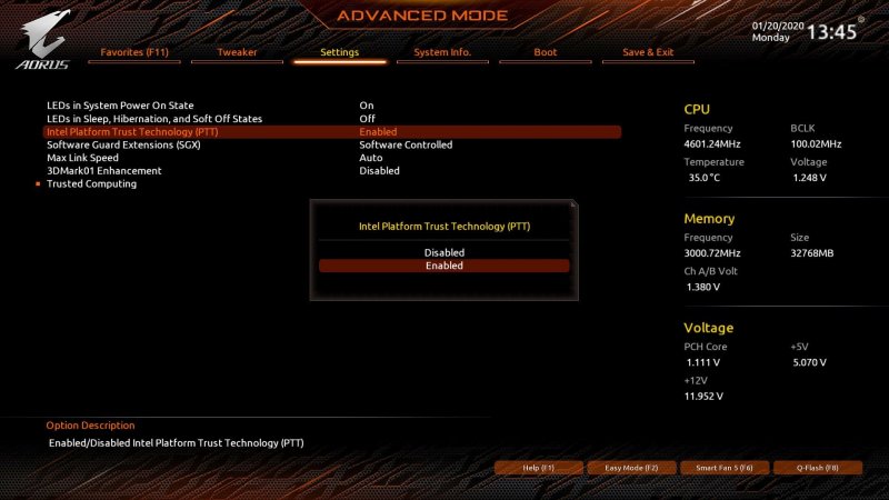 Включение TPM на платах Gigabyte на чипсетах Intel