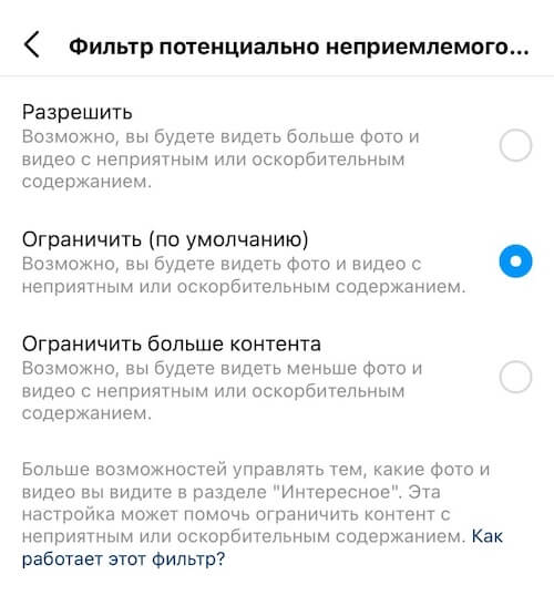 Новый функционал, помогающий в этом называется «Фильтр потенциально неприемлемого контента», который позволит управлять тем, какие фото и видео вы видите в разделе «Интересное».