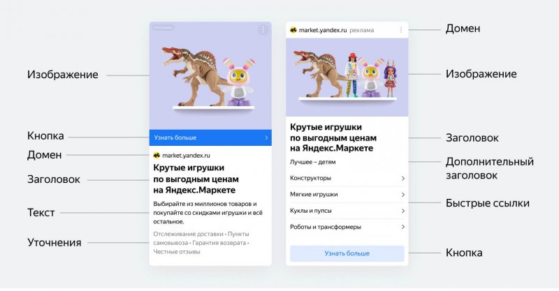 Когда посетитель заходит на сайт, алгоритм Smart Design мгновенно анализирует информацию о пользователе, площадке и данные от рекламодателя и создает наиболее подходящее объявление. Технология решает, показать картинку или видео, добавить побольше быстрых ссылок или кнопку и текст. В результате каждое объявление будет выглядеть по-разному.