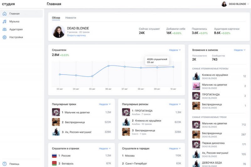 ВКонтакте вскоре откроет «Студию» для музыкантов. Это кабинет с уникальным набором возможностей, который позволит детально анализировать взаимодействие пользователей с музыкой артиста.