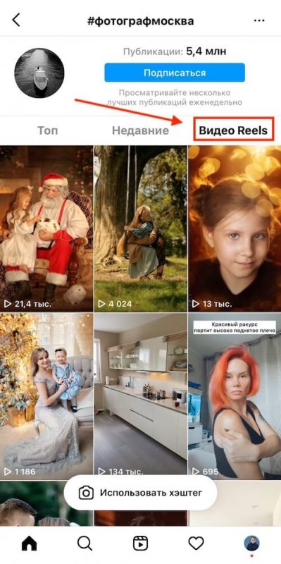 На этой вкладке показываются популярные Reels, в которых использовался данный хэштег.