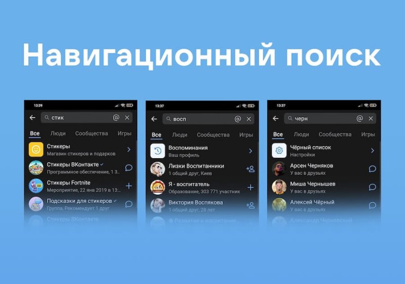 В мобильном приложении ВКонтакте появился навигационный поиск. С его помощью можно находить функции, настройки и разделы приложения.
