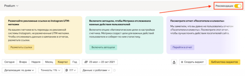 Рекомендации показываются над основным блоком с данными. Чтобы их отключить, воспользуйтесь переключателем в правом верхнем углу.