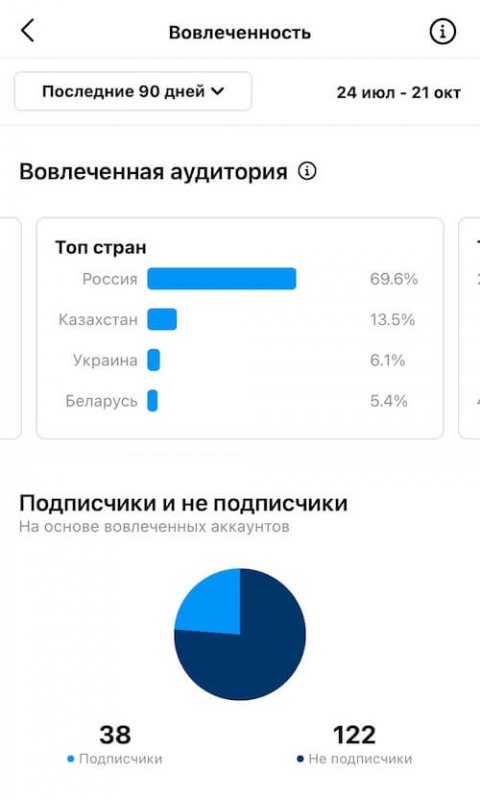- Вовлеченная аудитория — пользователи, которые взаимодействуют с вашим контентом, независимо от того, подписаны ли они на ваш профиль или нет, включая данные о городах, странах, возраст и пол.