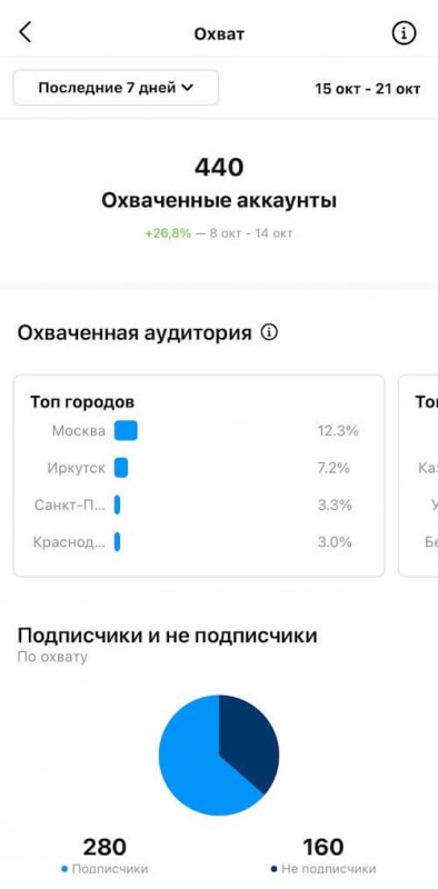 - Охваченные аккаунты — аналогично вовлеченным аккаунтам, показывает информацию о пользователях, которых вы охватили своими публикациями за определенный период времени, включая данные о городах, странах, возраст и пол.