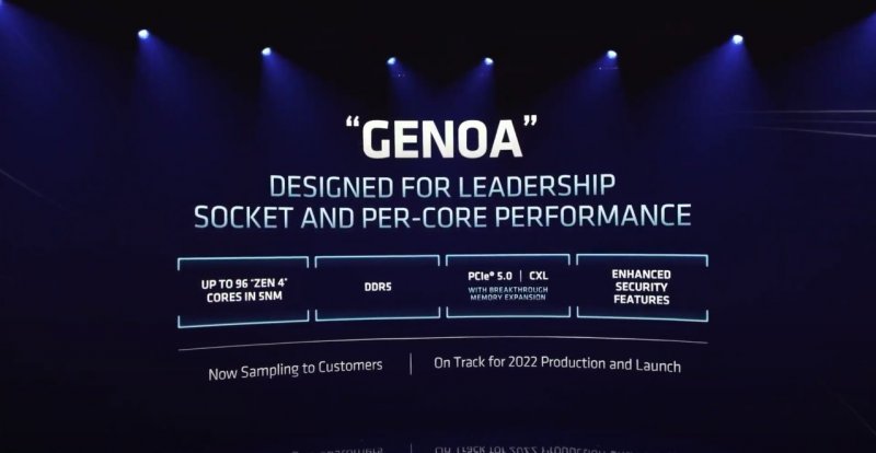 Глава компании AMD Лиза Су (Lisa Su) заявила, что чипы серии Genoa станут самыми высокопроизводительными в мире процессорами для вычислений общего назначения. В их составе будут использоваться до 96 высокопроизводительных ядер Zen 4, основанных на оптимизированном 5-нм техпроцессе компании TSMC. Эти чипы предложат поддержку нового стандарта оперативной памяти DDR5 и интерфейса ввода-вывода PCIe 5.0, а также будут включать поддержку CXL 1.1, обеспечивая значительные возможности расширения памяти для приложений центров обработки данных.