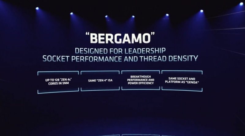 Вслед за Genoa компания AMD планирует запуск новой серии процессоров EPYC Bergamo, специально предназначенных для облачных приложений. Эти чипы смогут предложить до 128 высокопроизводительных ядер на основе оптимизированной под облачные вычисления архитектуре Zen 4c. Эти ядра программно совместимы с архитектурой Zen 4 и оптимизированы для создания конфигураций с большим количеством ядер для облачных рабочих нагрузок, которые выигрывают от максимальной плотности потоков.