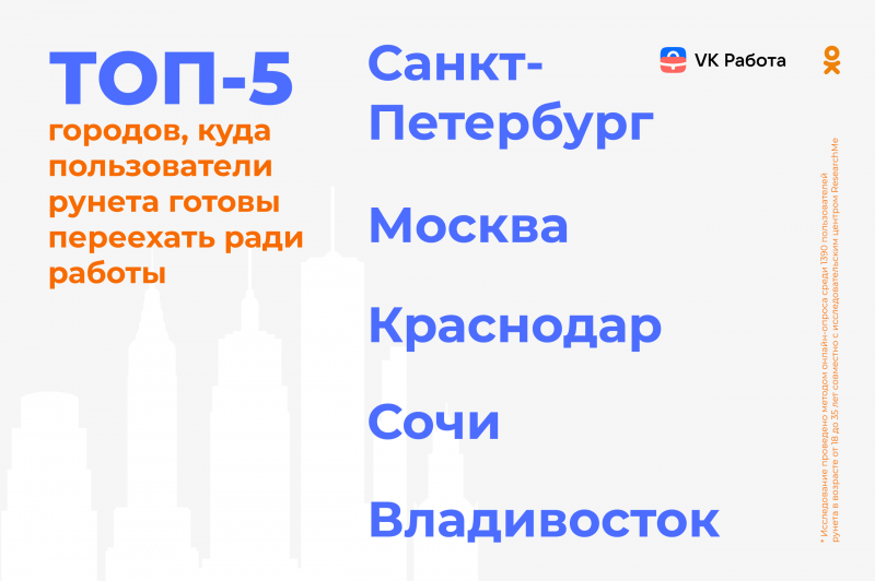 Социальная сеть Одноклассники совместно с сервисом VK Работа и исследовательским центром ResearchMe провели онлайн-опрос о том, сколько трудоспособных россиян хотели бы переехать в другой город ради работы, а также выяснили топ российских городов для переезда ради работы. В исследовании приняли участие 1 390 пользователей рунета в возрасте от 18 до 35 лет: работники сфер торговли, транспорта и связи, промышленности, госслужбы, информационных услуг, строительства, ЖКХ, сферы развлечений и масс-медиа и других.