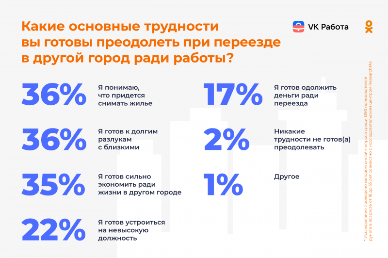 На вопрос, какие основные трудности респонденты готовы преодолеть при переезде в другой город ради работы, они отмечают, что готовы к долгим разлукам с близкими (36%), что придется снимать жилье (36%), что они смогут претендовать лишь на невысокую должность (22%) и будут вынуждены сильно экономить первое время (35%). Также 17% респондентов отметили, что готовы даже одолжить деньги ради переезда.