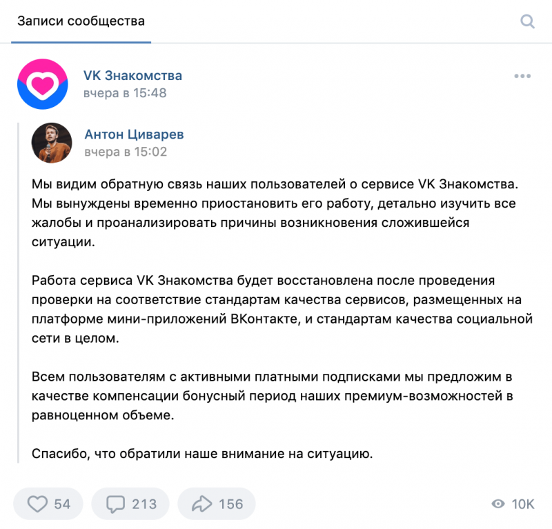 Далее, 25 ноября на официальной странице «VK Знакомства» во ВКонтакте, был сделан репост, сообщающий о временной приостановке работы сервиса «Знакомства».