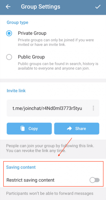 Чтобы включить защиту от копирования и пересылки, откройте в профиль чата, нажав на пункт «Тип группы/канала» > «Запретить копирование».