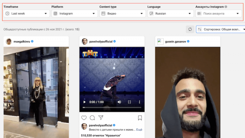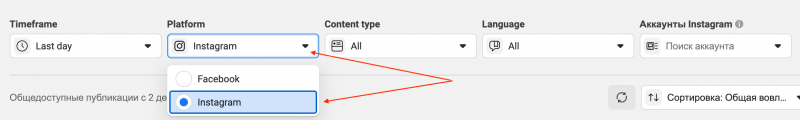 Чтобы переключиться на Instagram, нажмите на поле «Платформа» и выберите «Instagram». Для фильтрации контента доступны те же опции, кроме стран и категории страниц.
