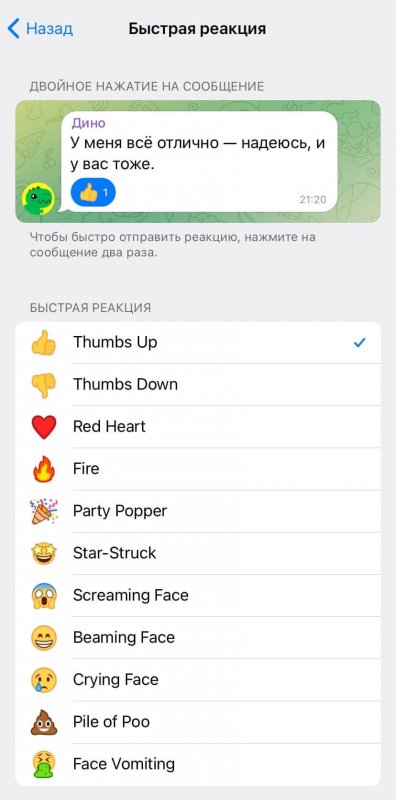 Чтобы изменить эмодзи основной реакции (которая работает по двойному нажатию), зайдите в настройки приложения. Далее выберите реакцию. Android: «Настройки чатов — Быстрая реакция». iOS: «Стикеры и эмодзи — Быстрая реакция».