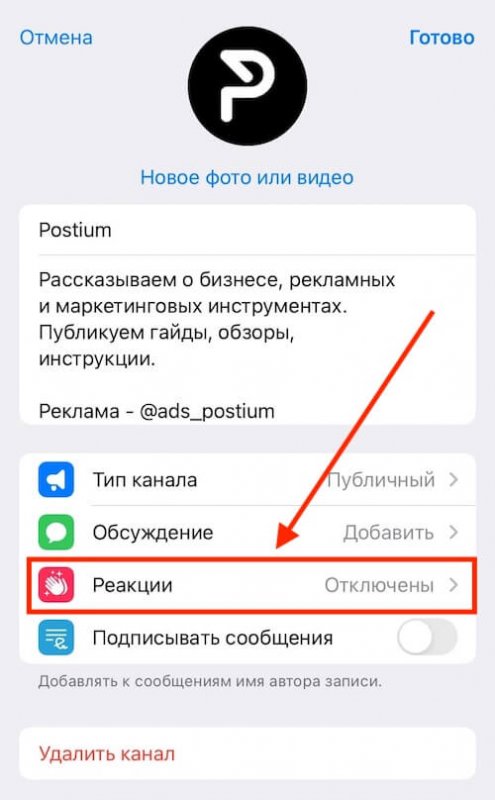Для настройки реакций в группе или канале Телеграм, откройте профиль и нажмите «Изменить». Далее выберите пункт «Реакции».