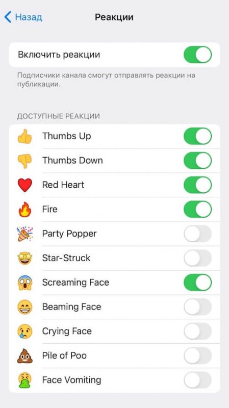 На открывшейся странице вы можете включить и выключить реакции под постами, а также настроить какие реакции будут доступны подписчикам. Например, можно включить только палец вверх/вниз или настроить реакции на свой вкус.