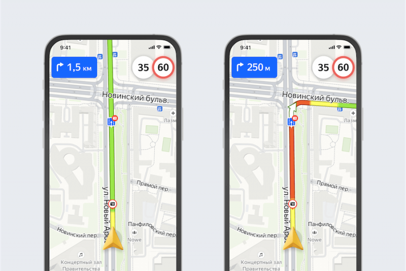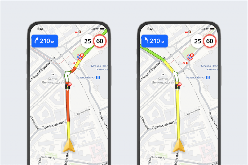 Теперь в зависимости от построенного маршрута в Картах и Навигаторе по-разному отображается загруженность на участке перед перекрёстком. Так, если для проезда прямо долго горит красный и накопилась пробка — на маршруте, проходящем в этом направлении, участок отмечается красным. При этом для маршрута, который идёт направо, он может остаться зелёным — если там пробки нет. Это поможет водителю оценить альтернативы и выбрать оптимальный путь.