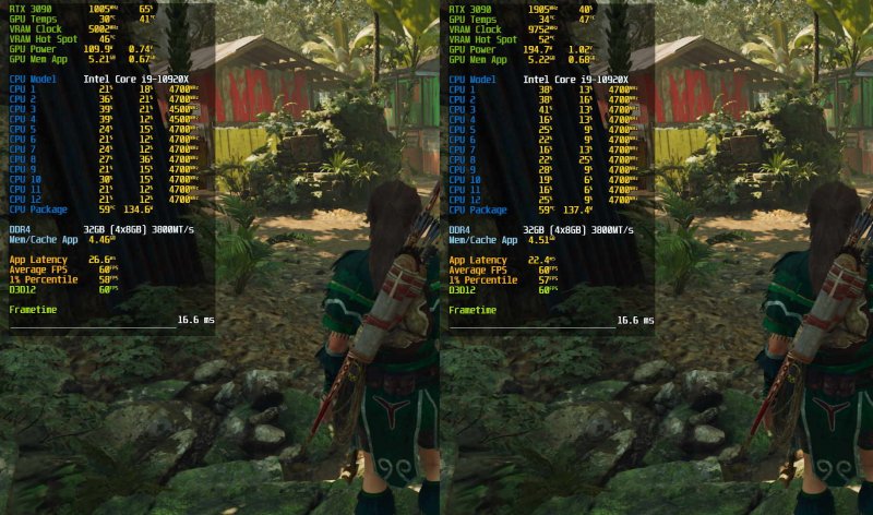 На изображении выше (справа) видеокарта GeForce RTX 3090 тестировалась в игре Shadow of the Tomb Raider ограничением частоты кадров в 60 FPS и установленными автоматически настройками. В этом случае карта потребляла около 195 Вт. После ручной настройки (левое изображение) энергопотребление при тех же параметрах снизилось примерно до 110 Вт, без негативных эффектов на производительность.