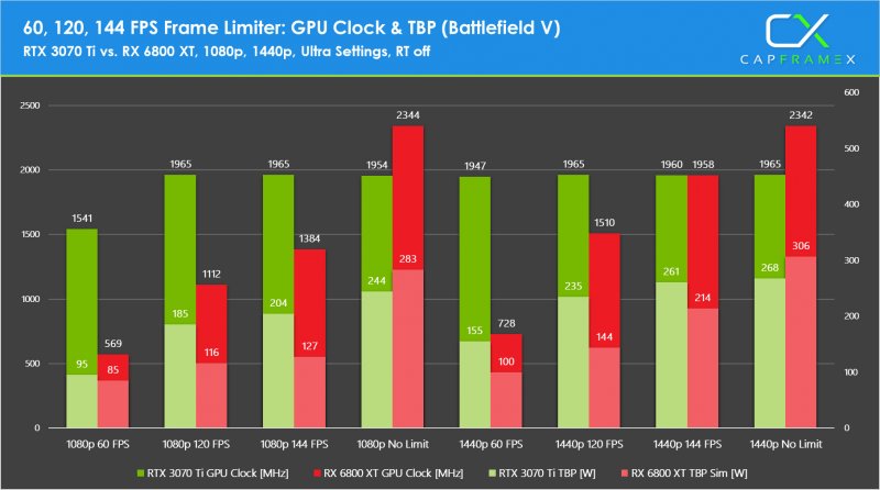 Со стороны AMD для сравнения использовалась видеокарта Radeon RX 6800 XT. Практически во всех случаях она значительно эффективнее ограничивала частоту GPU и показатель энергопотребления при ограниченном максимальном значении частоты кадров.