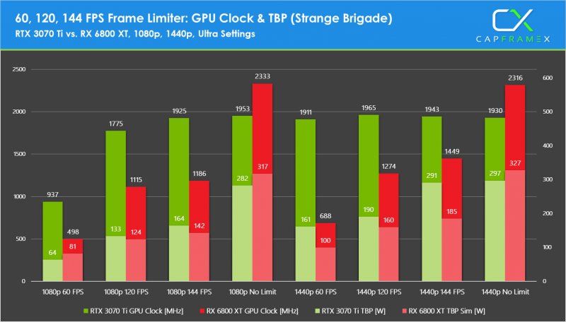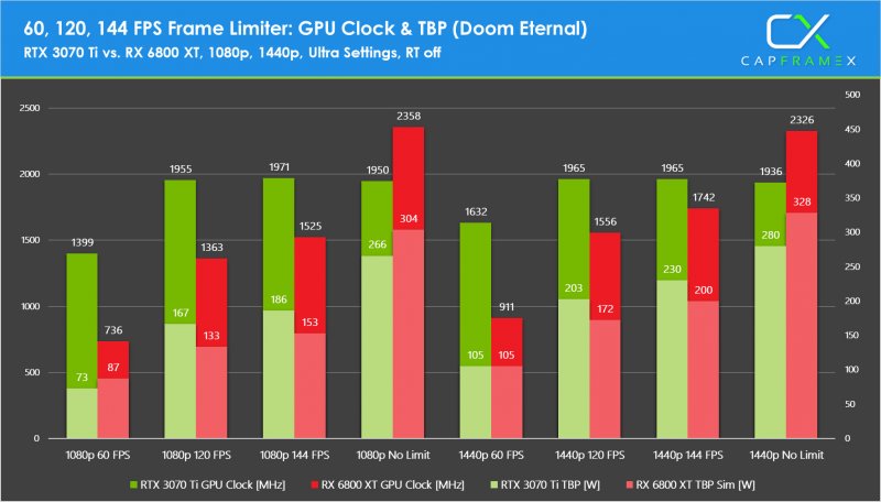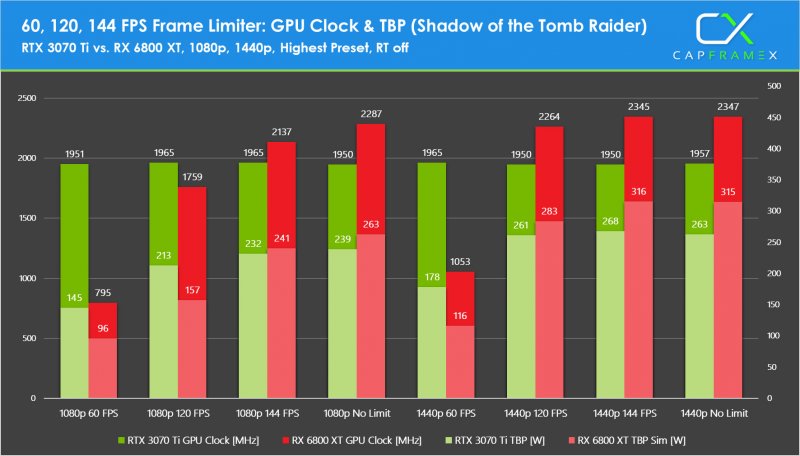 То же поведение отмечалось и для видеокарты GeForce RTX 3070 Ti. Тесты проводились с ограничением частоты кадров до 60, 120 и 144 FPS, а также без ограничения частоты кадров и с использованием разрешений 1080p и 1440p. В эксперименте помимо Shadow of the Tomb Raider использовались игры Strange Brigade, DOOM Eternal и Battlefield V. Во всех случаях карты GeForce пытались удерживать максимальное значение частоты работы GPU.