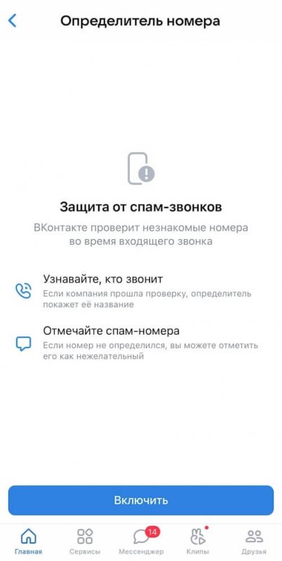 Включить сервис можно в настройках приложения ВКонтакте — в пункте «Определитель номера».