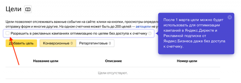 Эта опция уже появилась в настройках счётчиков, управлять ей можно в разделе «Цели». Чтобы дать разрешение на использование целей, включите опцию «Разрешить в рекламных кампаниях оптимизацию по целям без доступа к счетчику». Если вы недавно создали счетчик, опция включена по умолчанию.