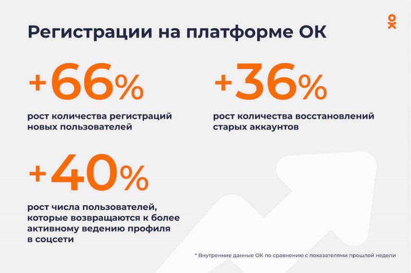 С начала марта рост регистраций пользователей в ОК превысил 66%. Кроме того, соцсеть фиксирует резкий рост восстановлений аккаунтов (на 36% по сравнению с предыдущей неделей) и пользователей, которые вернулись к более активному ведению соцсети — более чем на 40%.