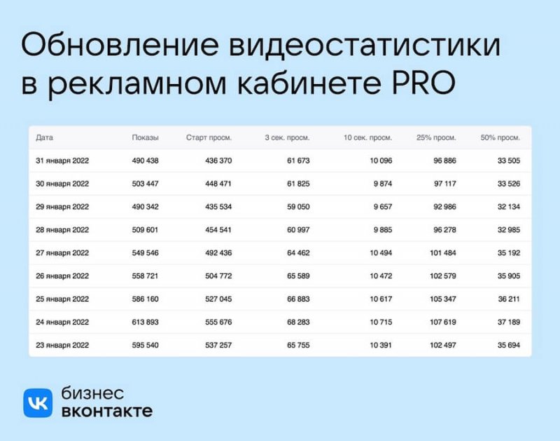 ВКонтакте представила обновление в статистике по видео в рекламном кабинете.