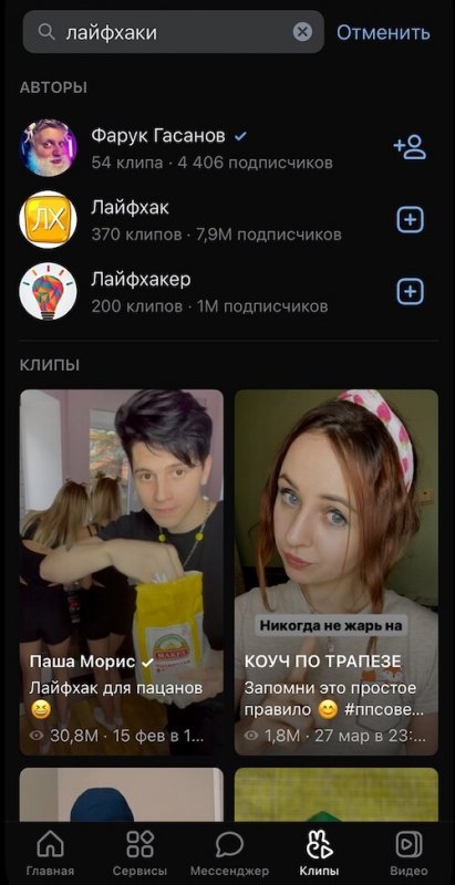Поиск находится на главной «Клипов» в правом верхнем углу. Новая функция поможет отыскать что-то определённое: видео, которое вы случайно пролистнули, ролик на определённую тему, а также любого автора по имени или нику.