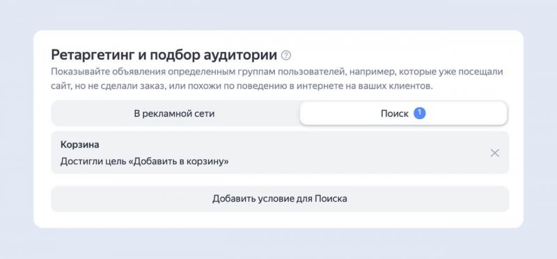 На Поиске ретаргетинг не может работать как самостоятельное условие показа, а оператор «ИЛИ» заменяется на «И». То есть объявления показываются пользователям, которые соответствуют и условиям ретаргетинга, и условиям показа: ключевым фразам или критериям автотаргетинга.