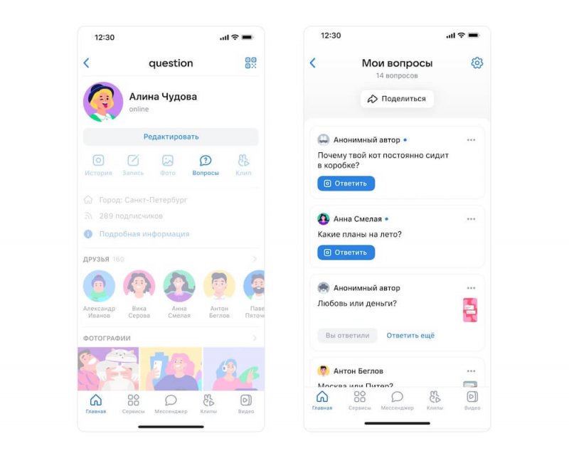 ВКонтакте представил функцию «Вопросы» для личных страниц. С помощью новой функции пользователи смогут задавать друг другу вопросы, отвечать в историях, в личных сообщениях или у себя на стене.