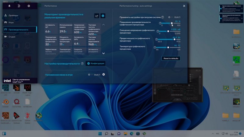 В рамках разгона энергопотребление видеокарты было увеличено на 55 %, повышено рабочее напряжение ядра GPU на 0,225 мВ, а также увеличена максимальная частота графического процессора всего на 100–150 МГц, что примерно на 4–6 % выше номинала. Разгон видеокарты через стороннюю программу MSI Afterburner пока невозможен, поэтому для изменения настроек использовалась собственная утилита Intel Arc Control. Результат таких манипуляций оказался поразительным.