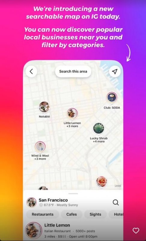 Instagram* представил новую функцию — поиск мест и компаний на карте. Теперь, компании, которые есть в соцсети можно будет найти на карте прямо в приложении, а также посмотреть дополнительную информацию по ним.
