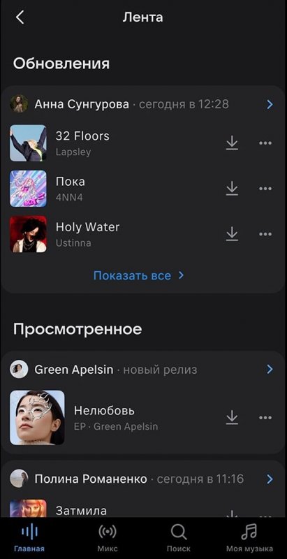 — В ленте музыкальных обновлений показываются новые релизы, плейлисты и отдельные песни, которые добавили за последнюю неделю музыканты, кураторы пользователи и сообщества, на которые вы подписаны.
