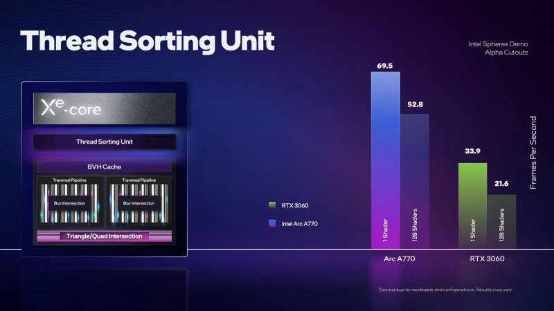 В составе архитектуры Intel Arc Alchemist применяется новый тип ядер Thread Sorting Unit, которые отвечают за асинхронную трассировку лучей. Другими словами, они помогают максимизировать использование Xe-ядер, распределяя задачи трассировки в графическом конвейере для повышения эффективности и производительности.