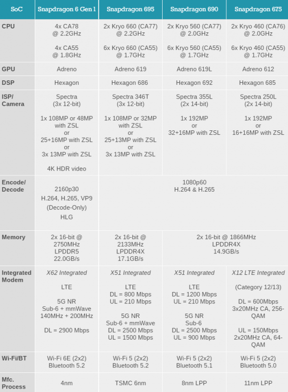 Новый Snapdragon 6 Gen 1 получил поддержку более скоростной оперативной памяти LPDDR5-5500 с пропускной способностью до 22 Гбайт/с, что на 29 % выше показателя LPDDR4x-4266, которая поддерживается чипами предыдущего поколения. Для нового чипсета также указывается использование 5G-модема Snapdragon X62 с возможностью работы с частотами в диапазонах ниже 6 ГГц и миллиметровом, а также есть поддержка Wi-Fi 6E и Bluetooth 5.2 Новая платформа позволяет использовать 108-мегапиксельный блок основной камеры с возможностью записи видео в 4K HDR при 30 кадрах в секунду.