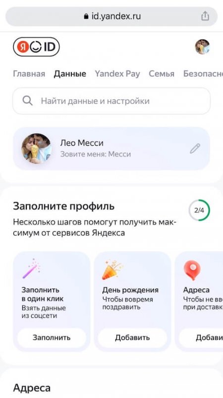 Раздел «Данные» содержит обширный перечень информации, в числе которой контакты, адреса, отзывы, сохранённые пароли (только в приложении Яндекс) и прочие.