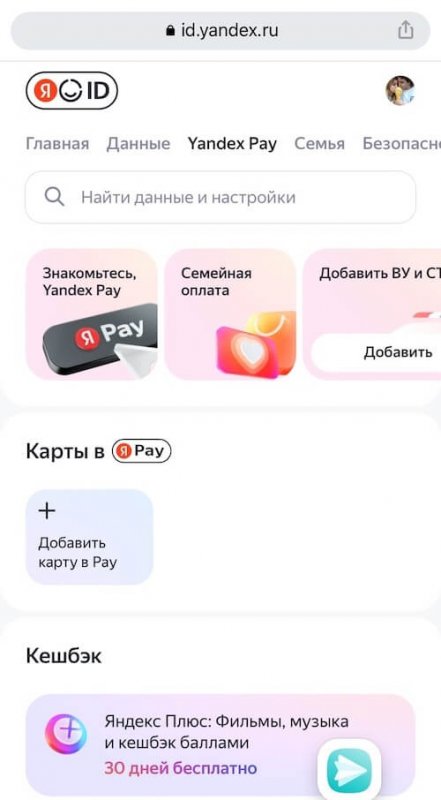 В этом разделе собрана вся платёжная информация. Здесь показываются привязанные к Yandex Pay карты, можно подключить семейную оплату, посмотреть свой кешбэк и электронные чеки, историю платежей, а также узнать количество баллов в Плюсе.