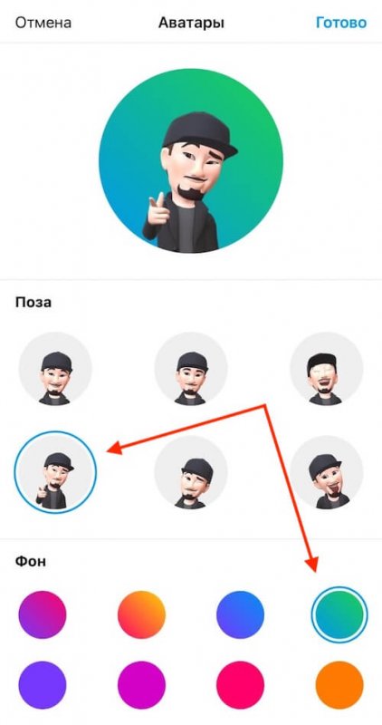 Шаг 3. Настройте отображение аватара. Выберите одну из шести поз и один из вариантов фона. После этого подтвердите изменения, нажав «Готово» в правом верхнем углу.