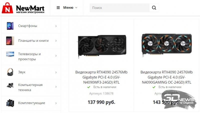Самую доступную GeForce RTX 4090 нам удалось найти в NewMart — видеокарта GeForce RTX 4090 WindForce здесь предлагалась за 137 990 рублей и на момент написания данной заметки её ещё можно было заказать.