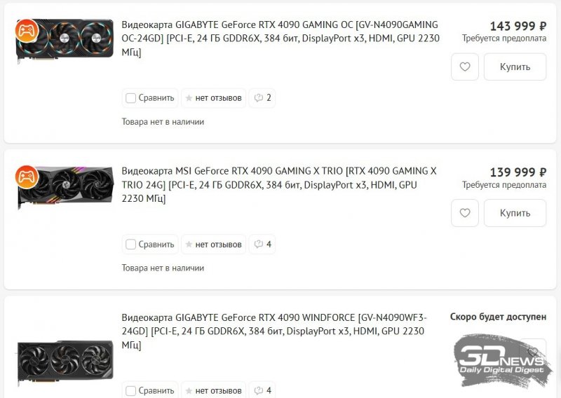 В основном российские магазины предлагают модели от компании Gigabyte — версии GeForce RTX 4090 WindForce и RTX 4090 Gaming OC, а в ассортименте «ОнлайнТрейда» также нашлась GeForce RTX 4090 Aorus Master, но её не было в наличии. Помимо этого, в российскую розницу поступила видеокарта MSI GeForce RTX 4090 Gaming X Trio, но найти её можно было только в DNS. Все это не самые продвинутые модели в ассортименте MSI и Gigabyte, но и не базовые — что-то среднее и потенциально оптимальное.