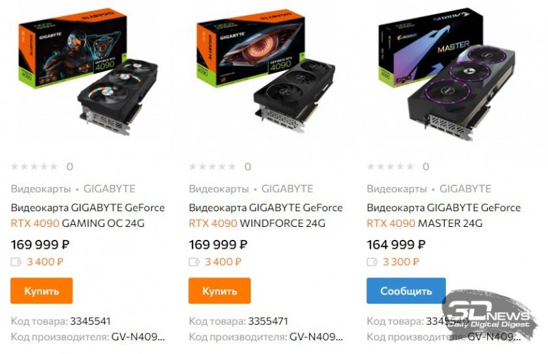 Самые дорогие предложения оказались в «ОнлайнТрейде» — здесь видеокарты Gigabyte RTX 4090 Gaming OC и RTX 4090 WindForce предлагаются по цене 169 999 рублей. В целом же средняя цена нового флагмана NVIDIA в российской рознице оказалась ниже 150 тыс. рублей.