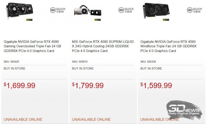 Добавим также, что на Западе первые партии GeForce RTX 4090 уже раскупили во многих магазинах. Например, в американском Newegg в наличии осталась только самая дорогая версии — ZOTAC GeForce RTX 4090 Trinity за $2250. Остальные модели с ценой от рекомендованных $1599 до $2000 уже раскупили. У американского MicroCenter заказать новый флагман онлайн невозможно, но видеокарты якобы есть в наличии в розничных магазинах.