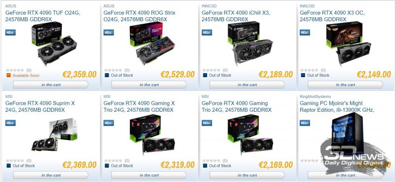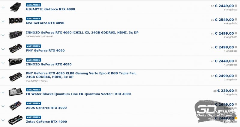 Что касается Европы, то здесь неприятно удивили ценники на новые видеокарты. Так в Германии, согласно агрегатору цен Geizhals, большинство предложений начинается с отметки в 2450 евро. Хотя в CaseKing нашлись и более выгодные предложения — от 2150 евро, но видеокарт не оказалось в наличии.