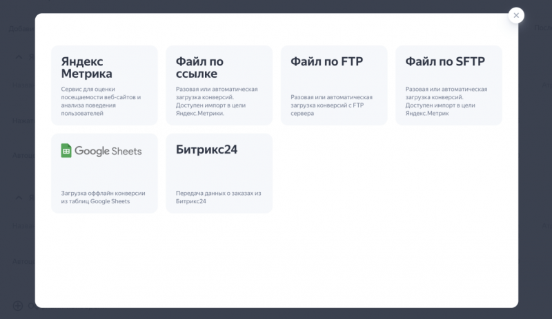 Через Центр конверсий можно передать данные о конверсиях на всех этапах воронки продаж и со всех источников трафика. Для загрузки нужно создать файл с конверсиями и загрузить его на любой удобный для вас источник. Центр конверсий сможет скачать файл по ссылке, с FTP- или SFTP-сервера или с Google Sheets. Для привязки конверсий к визитам на сайте в файле можно указать идентификаторы пользователей: ClientID из Метрики или телефонные номера, email или хеш от них.