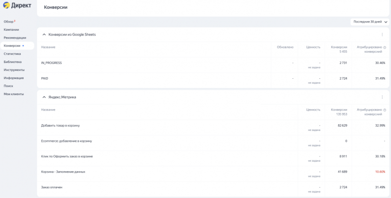 Центр конверсий позволяет собирать данные об онлайн и офлайн конверсиях со всех этапов воронки продаж прямо внутри интерфейса Директа.
