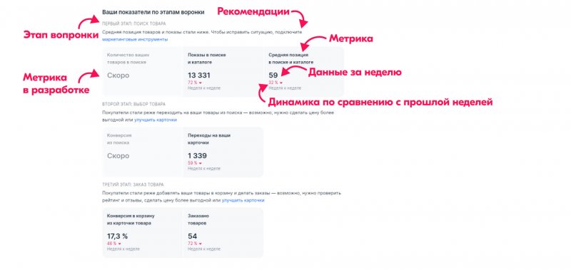 Здесь основные показатели магазина разбиты на три этапа воронки продаж: поиск, выбор и заказ, чтобы выявлять места, где теряется больше всего потенциальных покупателей. Показатели также рассчитываются за последние 7 дней и показываются в сравнении с предшествующими 7 днями.