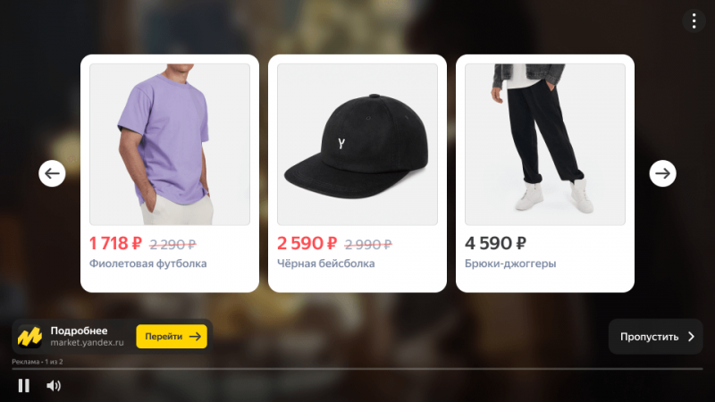 В потоковом видео карусель становится пэкшотом — финальным кадром после показа видео. Даже если пользователь пропустил видео, он увидит слайды с товарами в пэкшоте и сможет перейти по ним. Если видео показывается внутри контента сайта, карусель может появиться рядом с видеороликом, чтобы не мешать его просмотру.