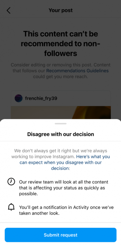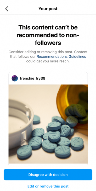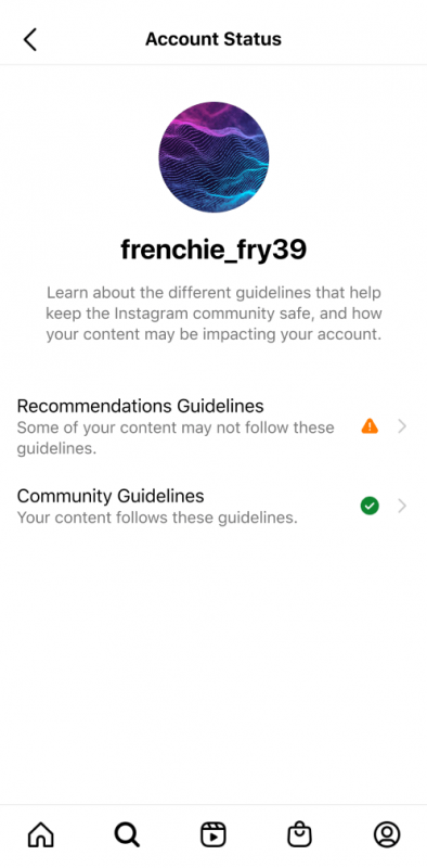 Если контент вашего аккаунта не может быть рекомендован, вы увидите пример контента или компонентов вашего профиля, которые могут противоречить правилам, а также любой контент, который был удален за нарушение принципов сообщества.