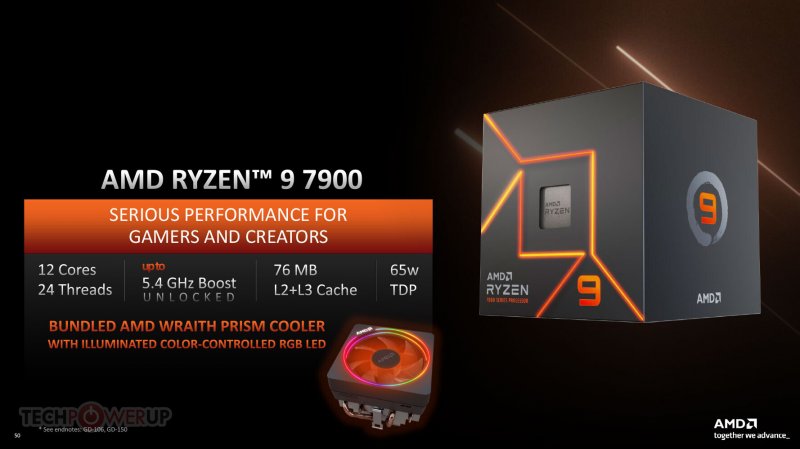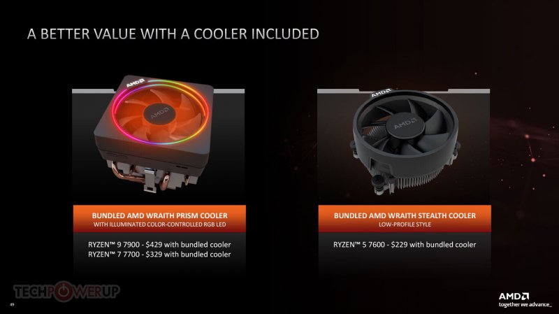 Коробочные версии указанных процессоров будут поставляться вместе с фирменными воздушными системами охлаждения. Так, младшая модель будет комплектоваться простеньким кулером Wraith Stealth, а вместе с моделями Ryzen 7 7700 и Ryzen 9 7900 производитель предложит более производительный кулер Wraith Prism RGB, способный справиться с рассеиванием до 140 Вт тепловой мощности.