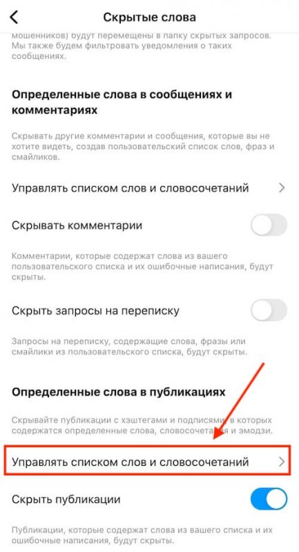 Управлять ключевыми словами и фразами, по которым скрываются рекомендации можно в настройках конфиденциальности «Настройки — Конфиденциальность — Скрытые слова — Управлять списком слов и словосочетаний».